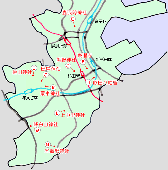 アルファベットは神社です。数字は磯子七福神のあるお寺です。数字は、磯子駅方面から七福神めぐりをするときに歩きやすい順番でつけました。