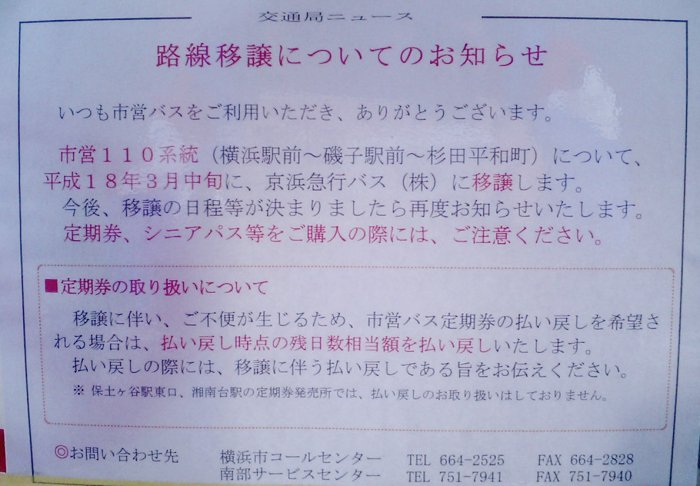 バス停にチラシが貼ってありました。横浜市営バス110系統が2006年3月に京急バスに譲渡されるのだそうです。譲渡によって、何か便利になるのか、ダイヤがどうなるのかなどはよくわかりません。ただ、定期は払い戻してくれるらしいです。