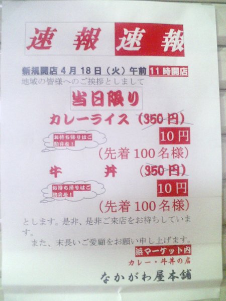 4月19日(火)、浜マーケットに新規オープンするカレー・牛丼の店「なかがわ屋本舗」がオープン当日午前11時から、限定の特別価格サービスをするようです。値段を聞いてビックリ。カレーライスと牛丼が通常価格350円のところ、先着100名さまずつたったの10円!(持ち帰りは不可)お店は浜マーケットの16号側を入ってすぐの左側です。浜マーケットの地図はコチラ。 (右のチラシはクリックで拡大します) |