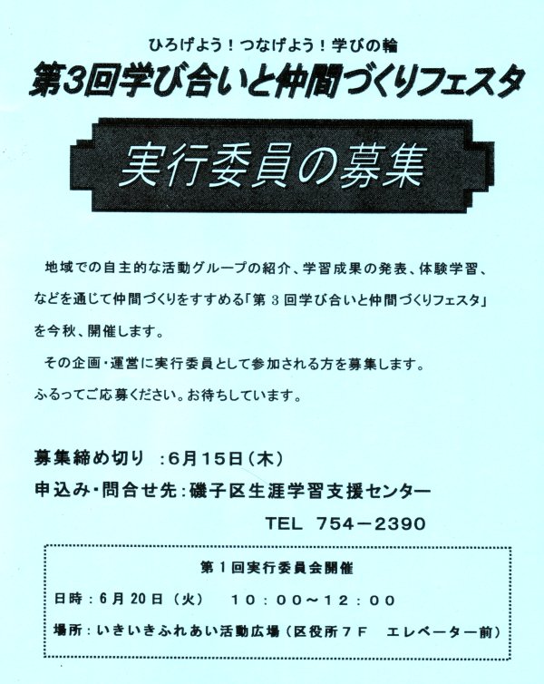 | 11月に開催予定の「第3回学び合いと仲間づくりフェスタ」では、フェスタを企画・運営する実行委員(ボランティア)を、ただいま急遽募集中だそうです。今回は区内の広範囲で開かれる予定なので、かなりのやりがいがある模様。「地域で知り合いを増やしたい」「企画力には自信がある!」、そんな方はぜひご応募を。 募集要項はコチラのチラシをご覧ください。また、「学び合いと仲間作りフェスタ」についてはコチラの記事をご覧ください。 |