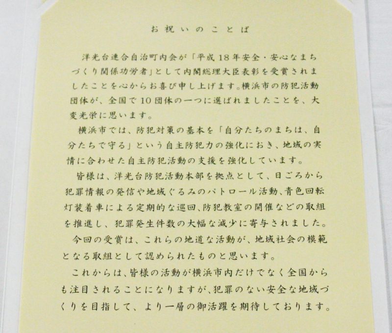 洋光台連合自治町内会が内閣総理大臣表彰を受賞したことを記念するつどいが、11月21日(火)、洋光台の横浜こども科学館で開かれました。![]() ※写真をクリックすると、中田市長からの「お祝いのことば」を拡大できます。 洋光台および磯子区での犯罪の減少は今年に入っても顕著で、磯子区での犯罪発生件数はピークだった平成14年に比べ、今年10月現在42.4%減少(県平均は34.6%減)。これは市内21警察署の中でトップの成績。また、洋光台交番の所轄管内では同57%も減少しているんだそうです。 ◆内閣総理大臣表彰についてはコチラ |